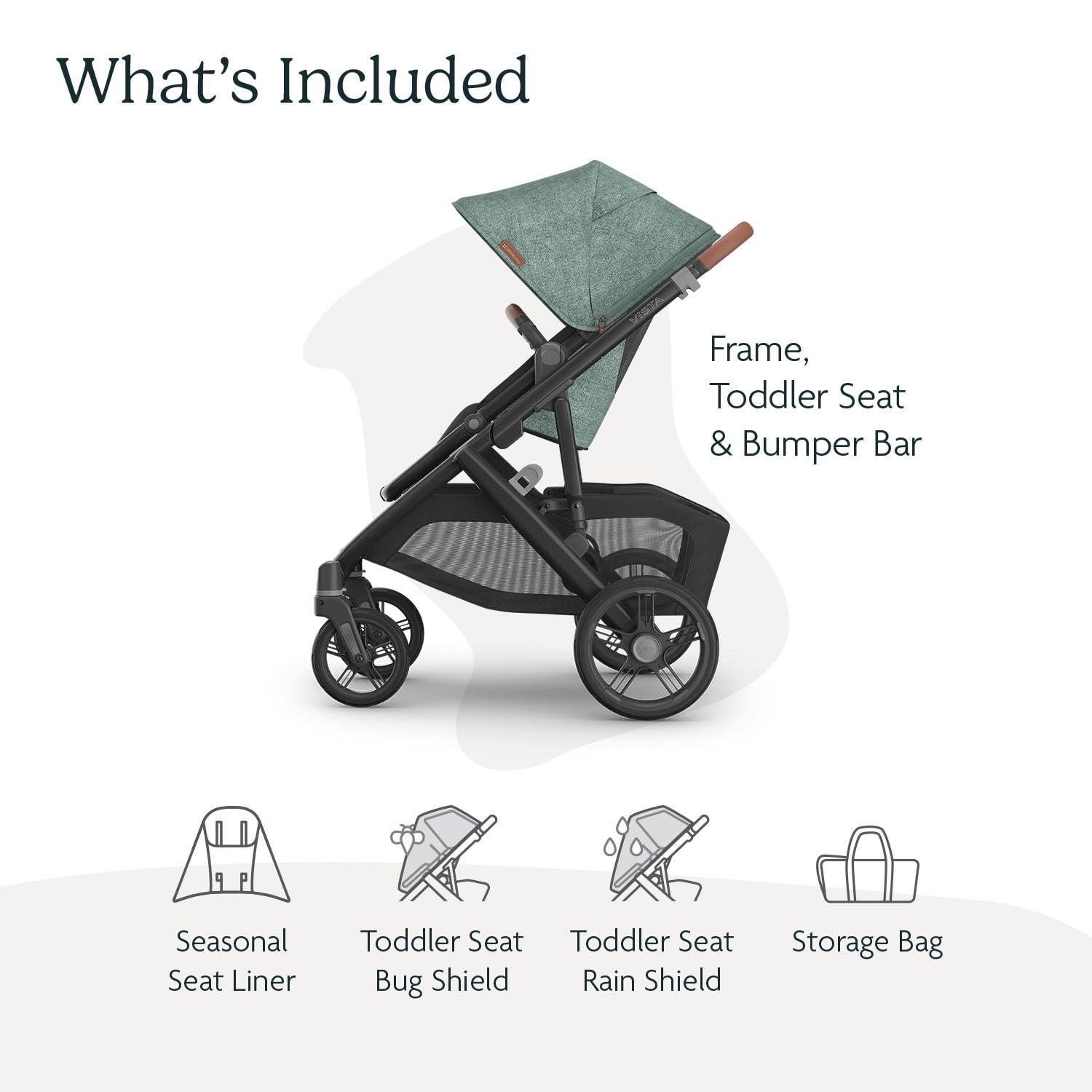 UPPAbaby Vista V3 Stroller – Full-Size Single-to-Double Stroller System – Toddler Seat, Bug Shield, Rain Shield, and Storage Bag Included – Gwen (Green Mélange/Carbon Frame/Saddle Leather)(Declan (Oat Mélange))