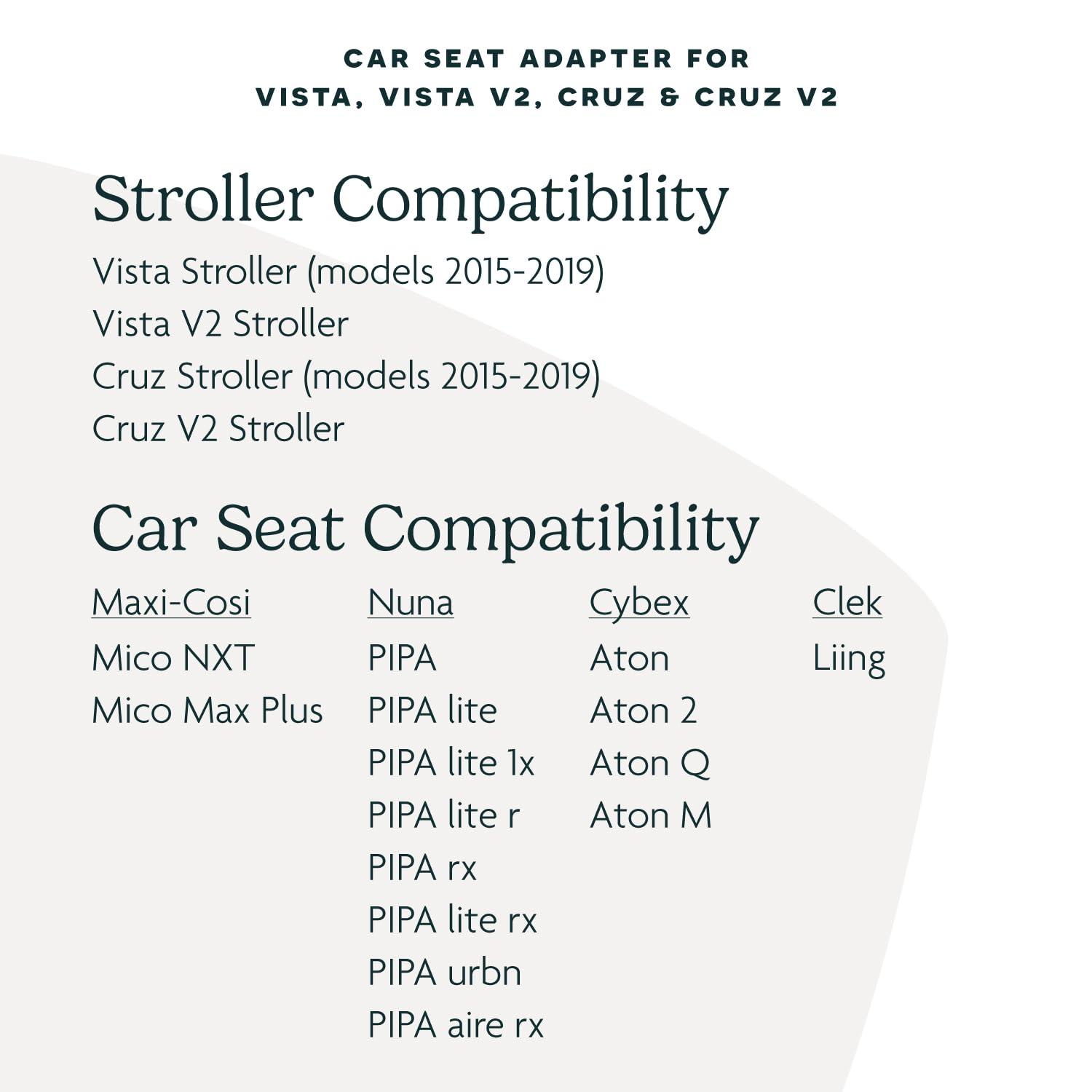 CREATE A TRAVEL SYSTEM: These adapters allow you to fit select Maxi-Cosi, Nuna, and Cybex infant car seats to the frame of your Vista or Cruz stroller, taking baby straight from the car to the road