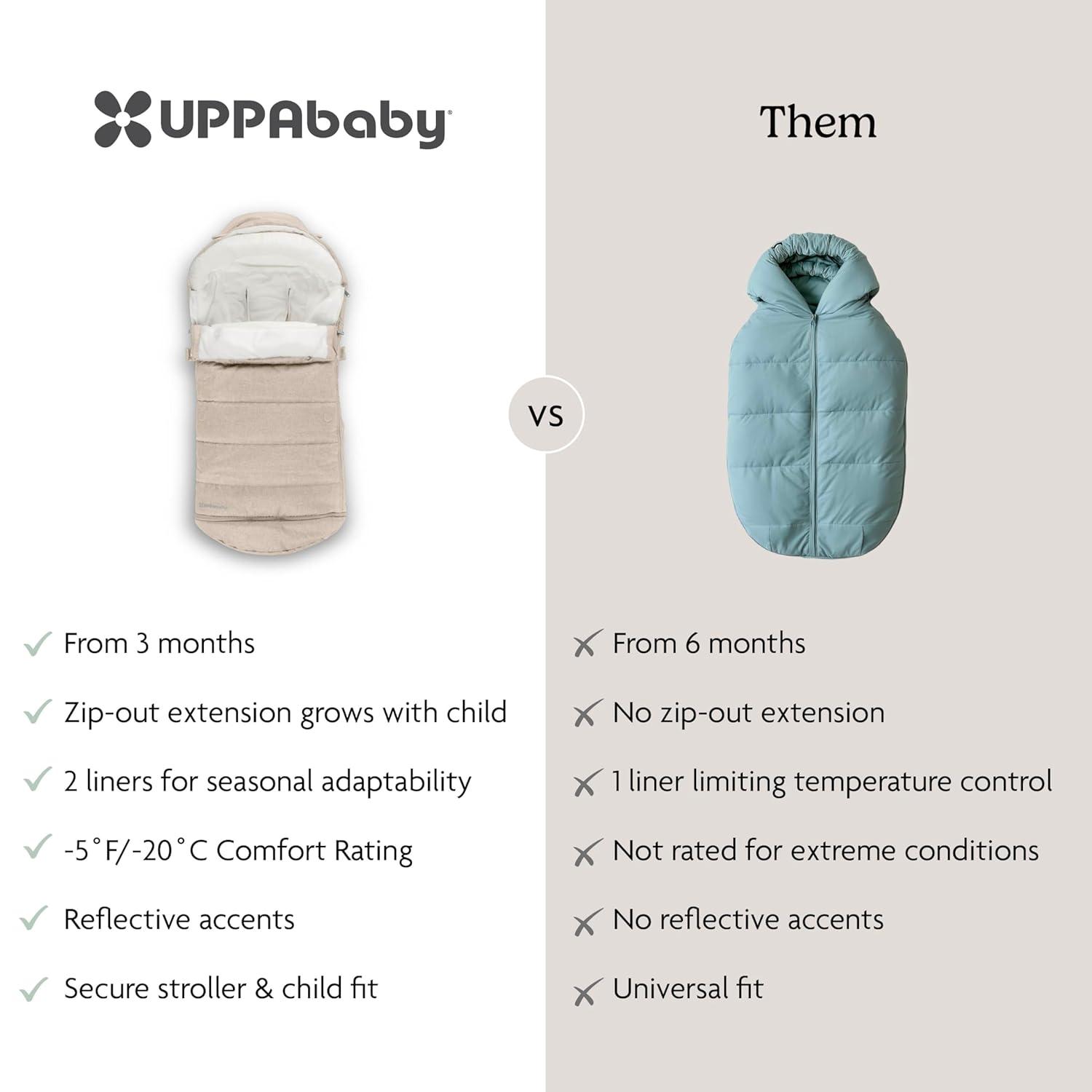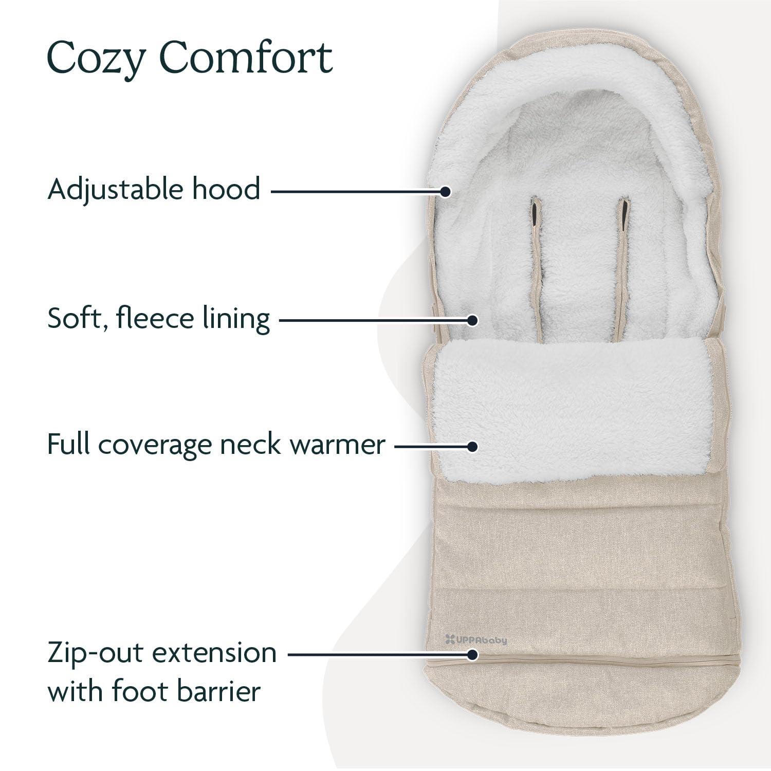 Engineered for ultimate comfort and versatility, the CozyGanoosh® Luxe 2-in-1 Footmuff keeps your child snug and protected through every season. Designed to fit all UPPAbaby strollers and the RumbleSeat® accessory, it combines plush, fur-alternative warmth with lightweight adaptability, growing with your child from infant to toddler. With thoughtful details like reflective accents, easy-clean fabrics, and a secure, stay-put fit, the CozyGanoosh Luxe ensures your little one rides in comfort no matter the weather. Zip-out liner transitions easily for all-season adaptability, from frigid winters to breezy spring strolls Comfort-rated to -15°F/-26°C with warmest liner and 20°F/-7°C with lightest layer Plush fur-alternative top layer converts to breathable lightweight knit for year-round use Zip-out extension grows with your child up to 4 years old Windproof and water-repellent outer shell resists the elements while staying soft to the touch Reflective details enhance visibility during early morning or evening walks Adjustable hood rolls back neatly when not in use for customizable comfort Hook-and-loop harness slots and anti-slip grips ensure a secure fit in strollers and RumbleSeat® Machine-washable design for easy care and cleaning Coordinates with CozyHandmuffs Luxe accessory for added warmth and style (sold separately)