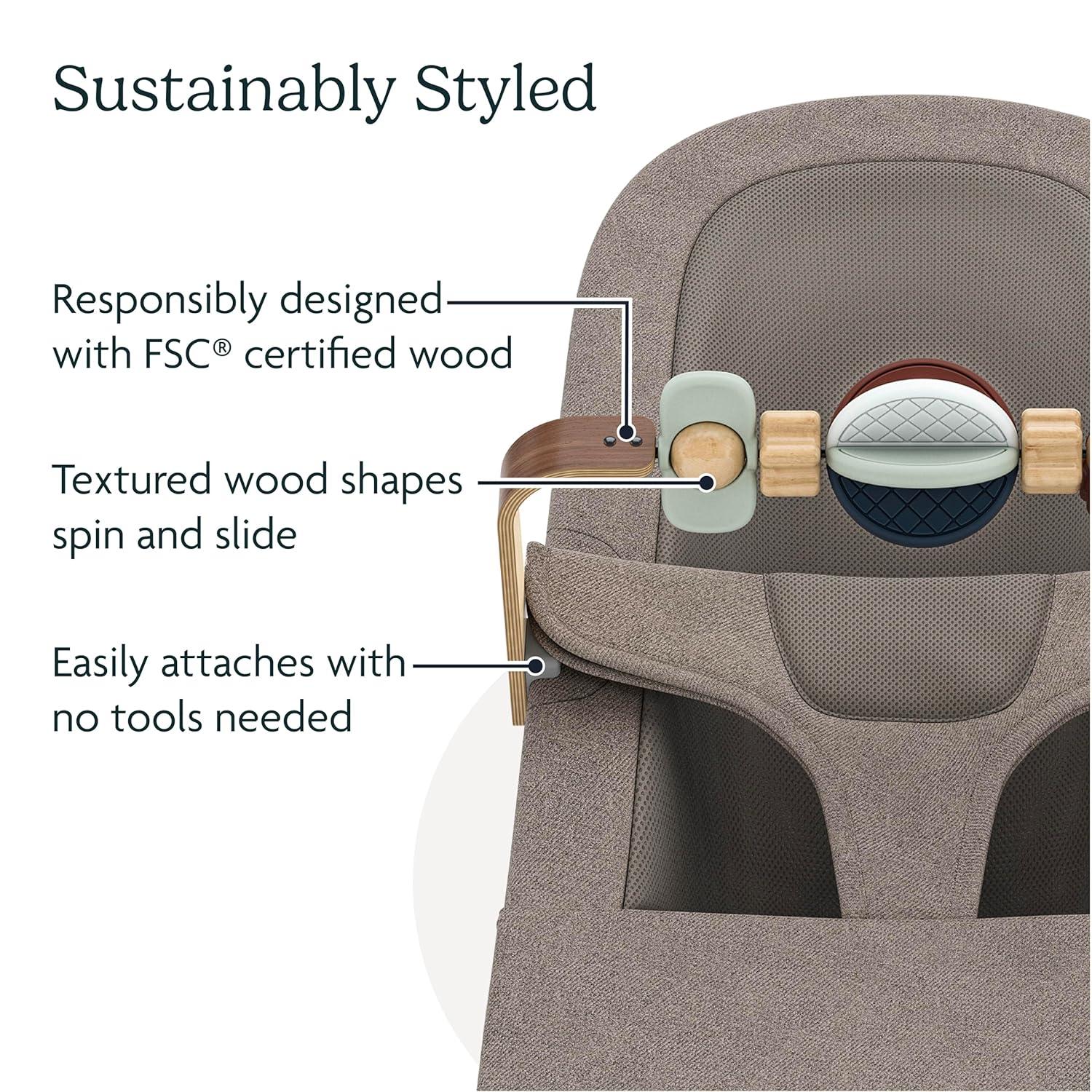 Cozy, Calming, Comfort.™ A cozy place to play or lay, the Mira was designed to soothe and comfort baby while keeping them close. Following their natural movement, the 2-in-1 bouncer and seat gently rocks to their rhythm from newborn to toddler. The Colorful and textured wood shapes of the Wonder Wheel Toy Bar encourages fine motor skills with the coordination of hands, fingers, and eye movement. Playful design with spinning and sliding toys capture baby’s attention to keep baby engaged. Close for baby to explore and spin. Attaches easily to and folds with bouncer. Toy Bar Accessories for fine motor development and hand-eye coordination.