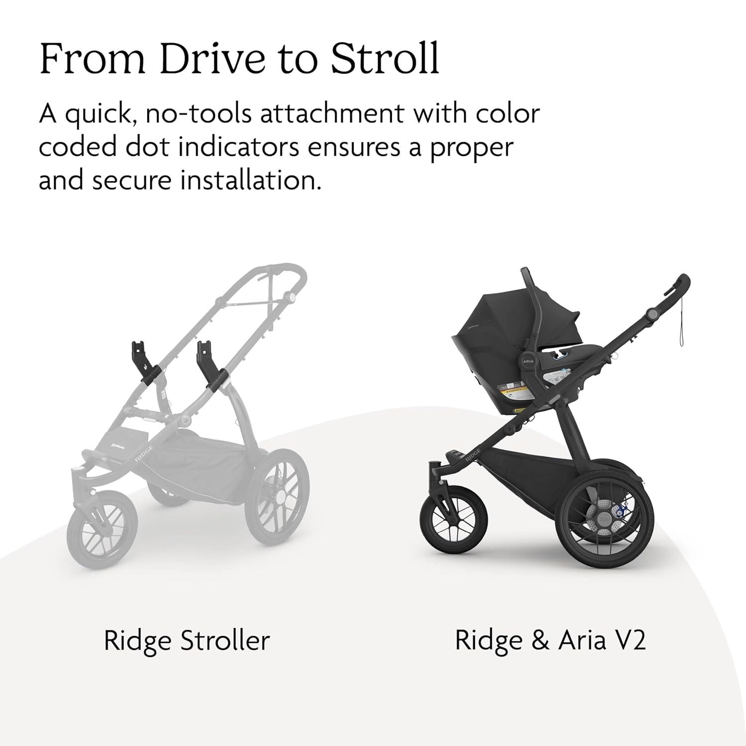 BUNDLE INCLUDES: Ridge Jogging Stroller, Basket Cover for Ridge, Cup Holder for Ridge, Aria V2 Infant Car Seat, Aria Base, Ridge Adapter for Aria