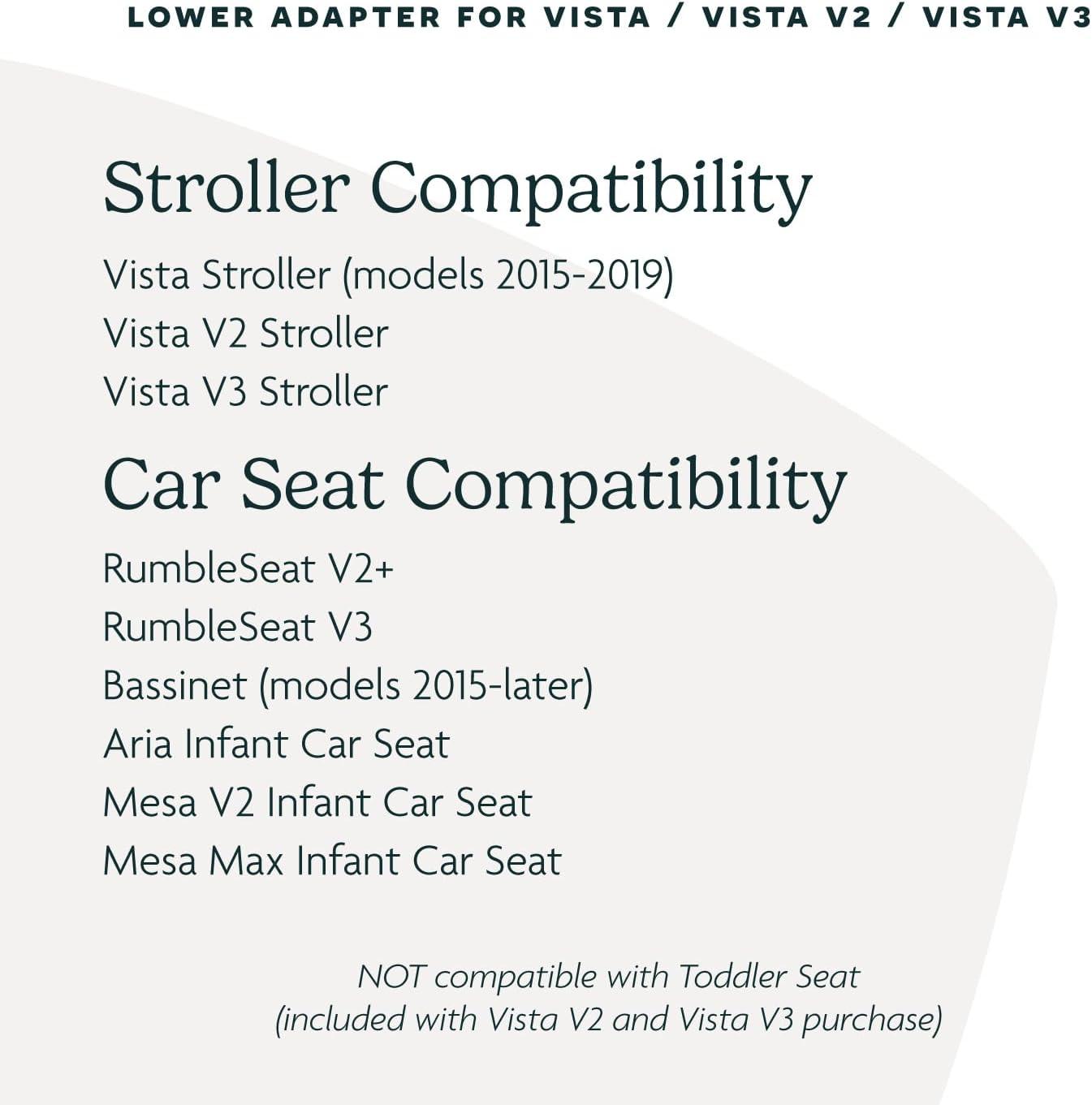 TO BE USED WITH: Toddler Seat (comes with Vista), Bassinet, Aria, Mesa/Mesa V2, Mesa Max Infant Car Seats. NOT compatible with RumbleSeat accessory.